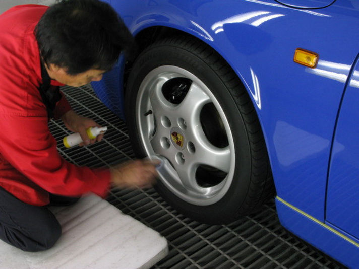 電動バフが大きすぎて当たらない場所やホイールなどは手で磨いていきます。