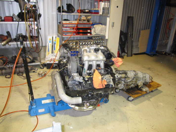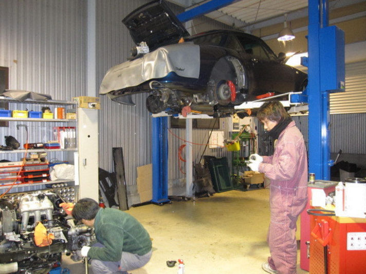 番頭伊藤 メカニック藤本との息の合ったコンビでエンジンの積み込み 作業です...... 写真で解るように エンジン台からエンジンアタッチメントを取り付けた ジャッキーにミッション取り付けて ホディーに結合していきます 911は他の車と異なり エンジンミッションにボディーを上から かぶせていくと言ったほうが正しい言い方ですが(笑)