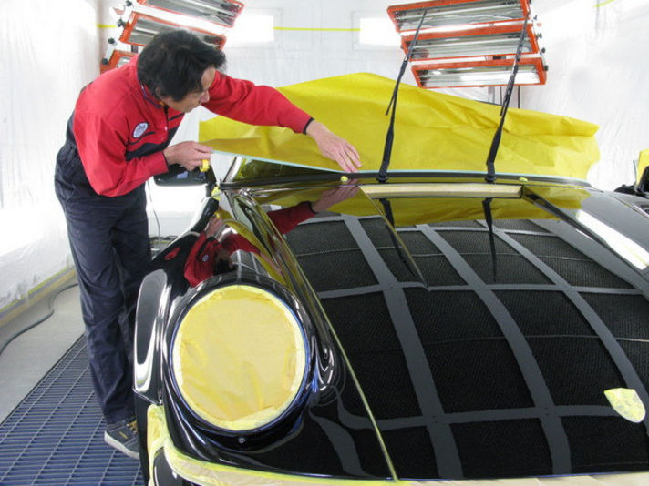 洗い終えると塗装ブースに移動させ、拭き上げながらエアーで水分を飛ばしていきます。水分もコーティング剤と混じり合えばシミの原因になります。