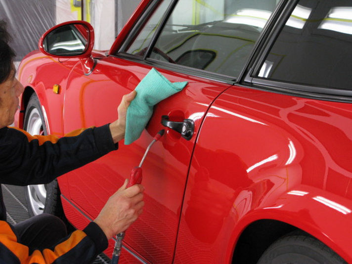 洗車が完了しましたので、塗装ブース内に移動させ、水分を取り除いていきます。エアーでドアハンドルの隙間などに残っている水滴も飛ばしていきます。