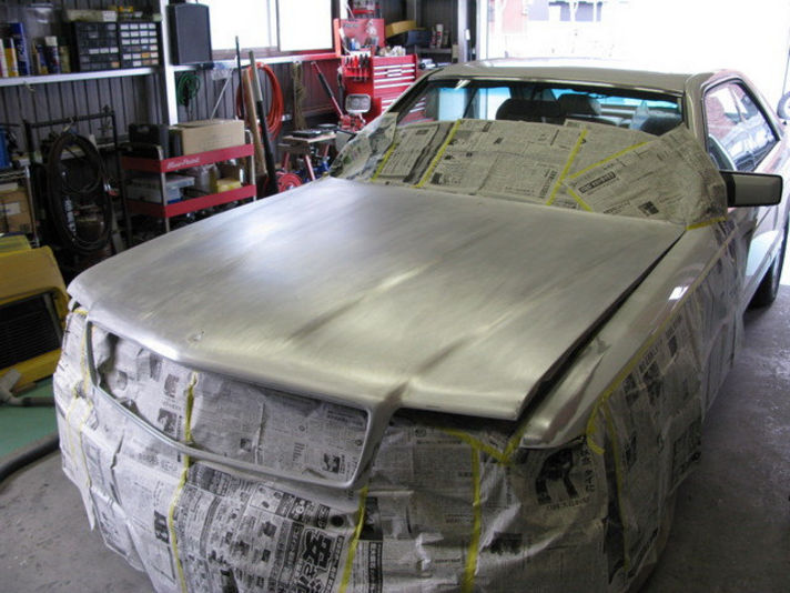 まずはボンネットから作業を始めます。 ボディ表面のクリアが硬化しひび割れしていたために再塗装いたします。 一旦、塗装をすべて剥離していきます。 剥離したボンネットに下地のサフェーサーを吹き付けます。 表面を平らにし塗装の食い付きを良くします。
