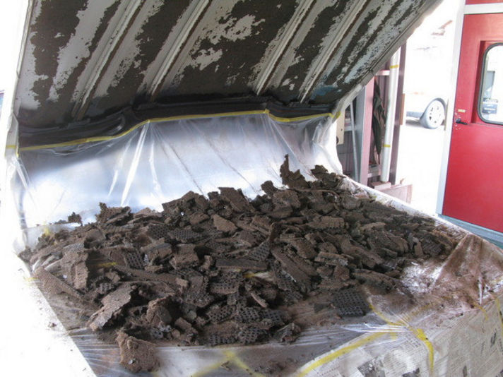ボンネット裏のインシュレーターもボロボロになっていましたので交換します。まるで蜂巣のように硬くなっていました。