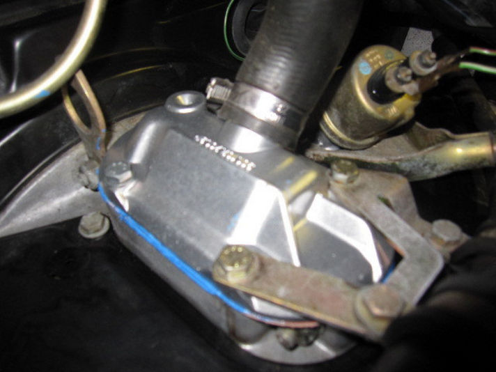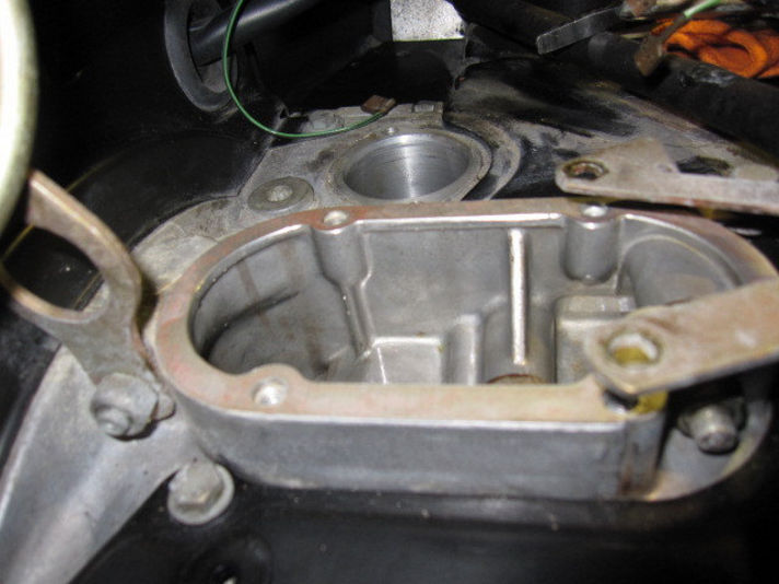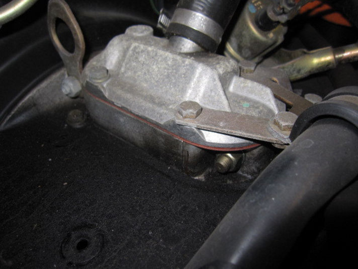 右の写真、新しいガスケットと今後の対策としまして、液体ガスケットと共に組み付けます。奥に見える部品がオイルプレッシャースイッチです。こちらのシールも一緒に交換です。
