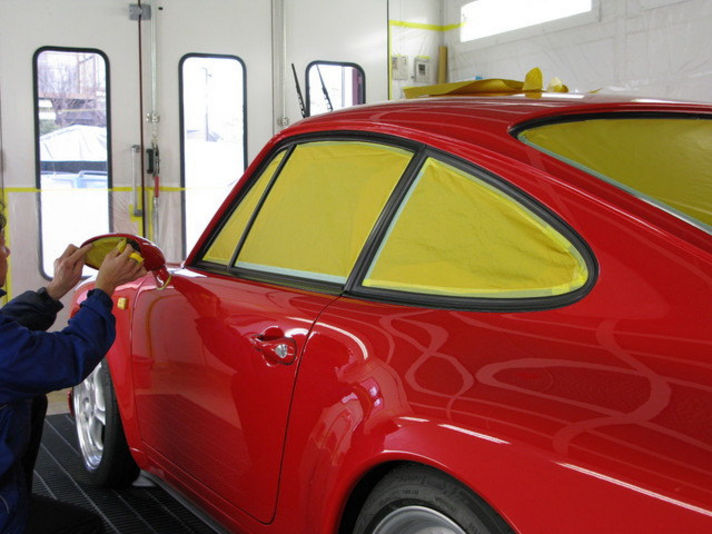 ドアミラーや付け根のゴムなど細かい所もマスキングを施していきます。