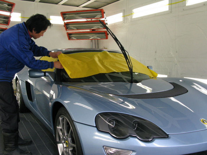 ミラーやウィンドウなど磨かない箇所はマスキングしていきます。