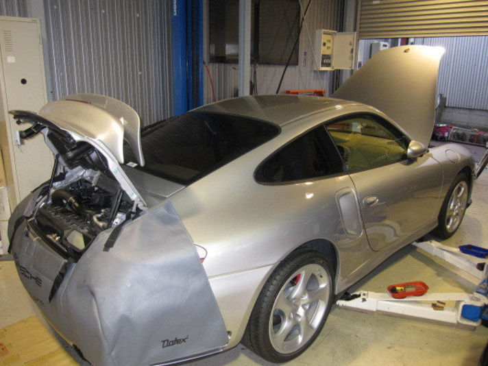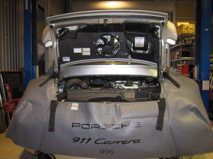 車両をリフトアップし、下廻り、足周り、エンジンルーム上側から点検を行い今回、作業する内容を決めていきます。 点検の結果、エンジンオイル、オイルフィルター、ブレーキオイル、 クーラント、スパーキプラグ、イグニッションコイル、Vベルト、 エアクリーナー、フューエルフィルター、A/Cフィルター交換します。 定期交換部品となりますが押さえておきたい箇所になります。 写真は、ボディカバーを取り付けたエンジンルームとリフトアップしている状態です。 右の写真は今回交換する部品です。
