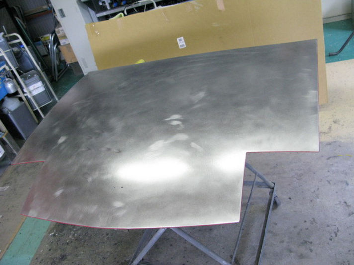 フロントフード表面のクリアが硬化し、ひび割れしていましたので再塗装致します。