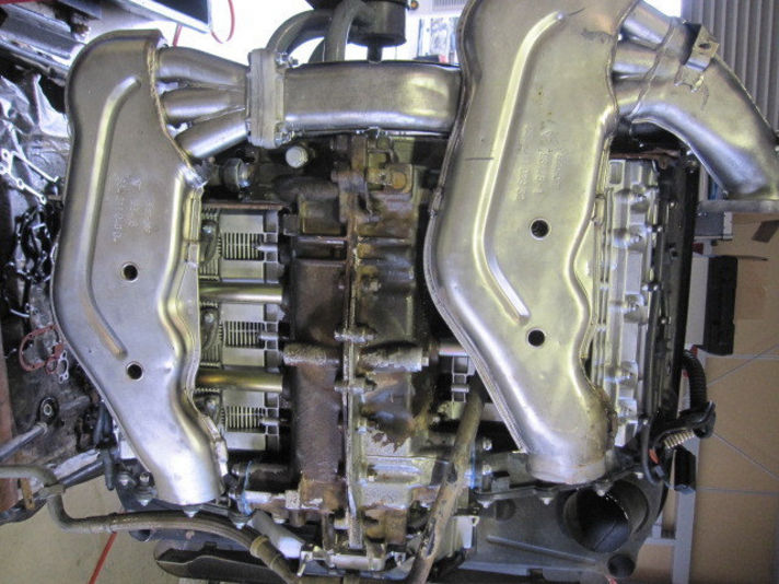 右の写真、インテーク、エキゾースト廻り全て取り付けた状態です。この後エンジンスタンドから降ろしA/Tと組みつけていきます。