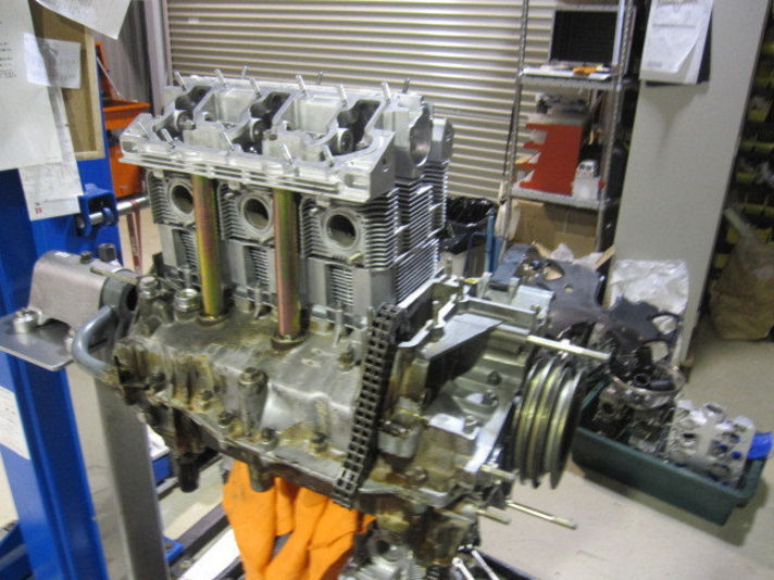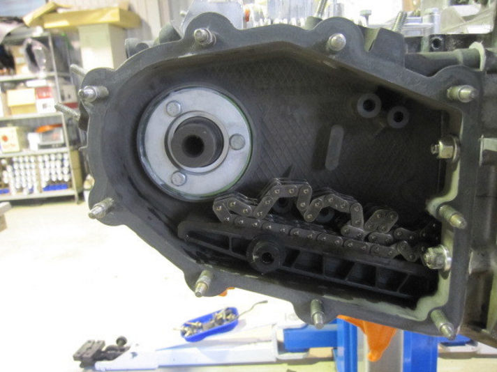 真ん中の写真、チェーケースを取り付け、カムシャフトを入れたところです。