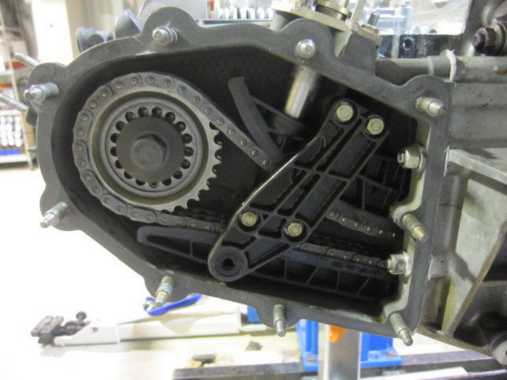 右の写真、スプロケットなどチェーンケースに収まる部品を全て取り付けたところになります。写真は片側ですが両側同じように組みつけていきます。
