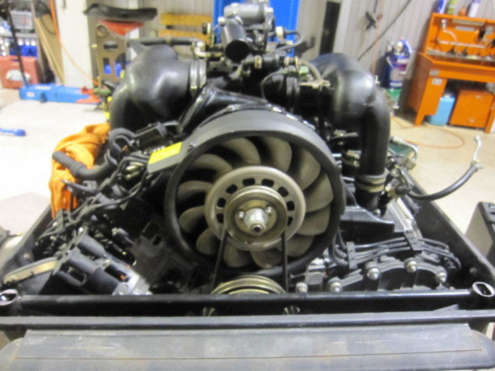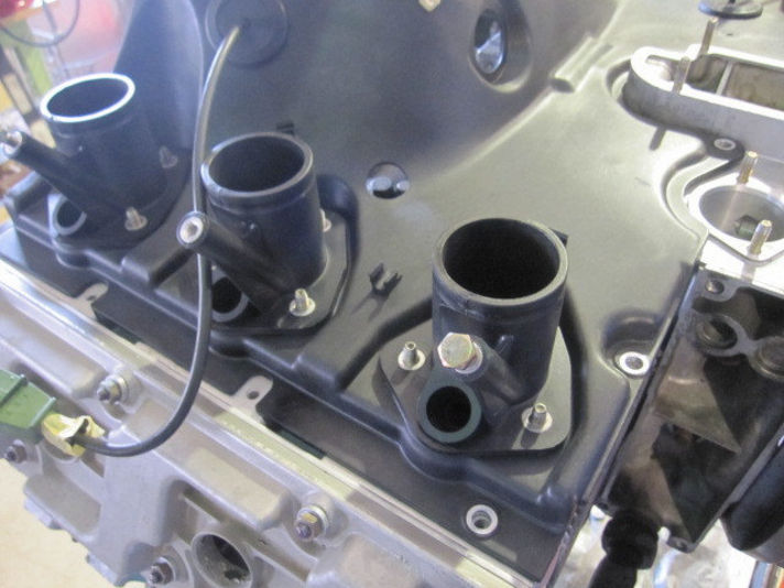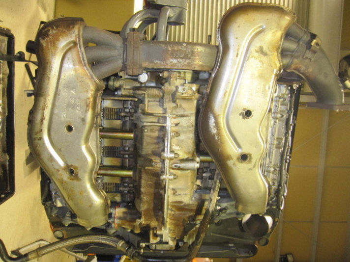エンジン単体は出来上がりましたので、吸気、排気廻りを取り付けていきます。 左の写真、インテークマニホールドを取り付け吸気廻りを順番に取り付けていきます。 真ん中の写真、吸気まわり、オルタネーターを取り付けたところです。 右の写真、エキゾーストマニホールドを取り付けてエンジンスタンドでの整備は完了となります。