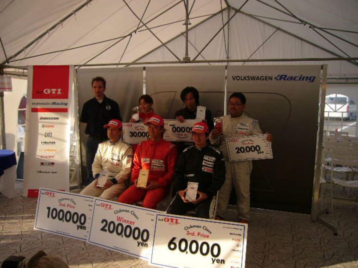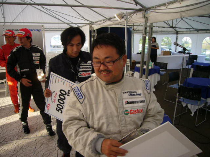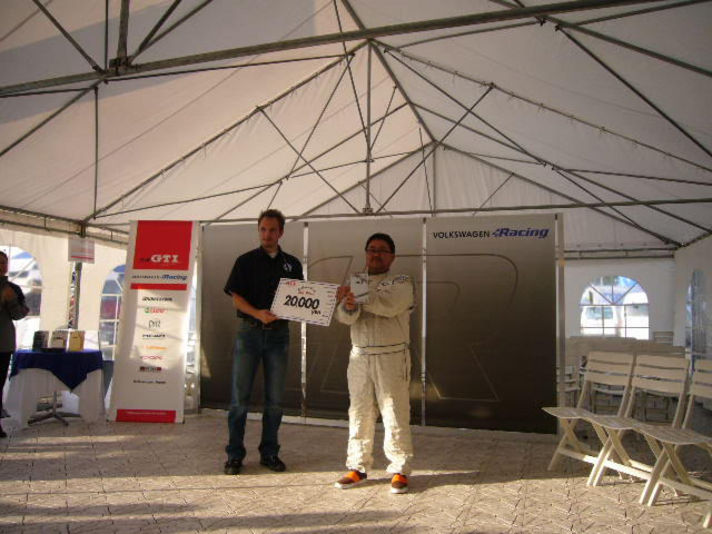 30日土曜日いよいよ予選決勝日 前日の天気予報に裏切られ 当日は雨も上がり路面はドライ残念また寺沢氏よりドライセッティングに 変更し予選に挑みました 終わって見れば予選はクラス8位と少し思っている順位より下でした(残念) このコースはワンメークのレースでは ほとんど抜く箇所が無く相手のミス意外では前に出ることがひじょうに難しく 今回も6位入賞(6位から縦 賞金有り)が遠く感じられましたが そこは能天気な私ですから 予選の反省を寺沢氏と打ち合わせしサイドセッティングをしてもらい昼からの決勝に挑むことになりました(予選時お守り忘れていました) 決勝は12周 今回で二回目となるローリングスタートを私なりに良い感じでおえ 前二台を追いかけるレースとなりました 三コーナーの上りで一台抜かれましたがここは前半無理せず 気を取り戻し追いかけることにしました 三周目に入り2コーナー出口で一台コースアウトしていてこれで順位は8位に戻り8周目最終コーナーで前方走る二台が大クラッシュ私は自分の所に飛に飛んでくる車を避けてクリアー(お守りのパワー)これで順位は6位しかし 前半で2コーナーでコースアウトした 私よりかなりタイムの良い車が後ろから追いかけてきました 残り四周どうにか押さえ写真のゴルフCUP二戦して 終わって見れば寺沢氏と約束した6位入賞いたしました\(-o-)/