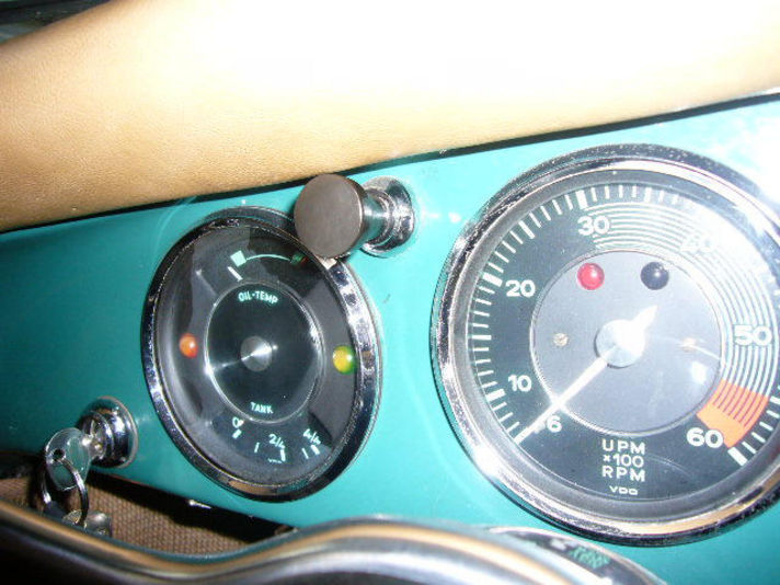 当社にある356について色々と勉強中です 写真の回転系の右上のレーバーは皆さん何か解りますか ライトスイッチではありません 現代の車にはほとんど付いていない もので スロットルチョークでエンジンをかける時とエンジンが温まるまで 回転一定に保つものです 使い方はまずエンジンに火を入れるに当たりアクセルを二回ほど 踏み込み このレバーを左にひねり引っ張りその位置で止めるのに右にひねります すると写真の位置で止まります(この状態でアクセルを少し踏み込んだ状態に固定)あとはセルを回しエンジンがかかると約1500回転あたりでアイドリングしエンジンが温まるとレバーを元の位置に戻すと約950回転で 綺麗にアイドリングします このようにこのレバーを使います |
