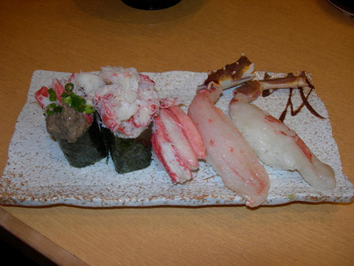仕事で福井県に行き 解禁になったばかりの獲れたてのかにを食べてきました 場所は 新設された福井駅の中で魚屋さんが経営する 少し高い目の回転すし です 上の写真のかにずくしと生秋刀魚すしいただきました 個人的には生秋刀魚の美味しさにビックリ(ただし回っている物はNG.注文すること) 値段はかにずくしは生たらば二貫ずわいかに足肉一貫ばら肉一寛 かに味噌一寛税込1050円秋刀魚200円一人2000円で秋をいただき |