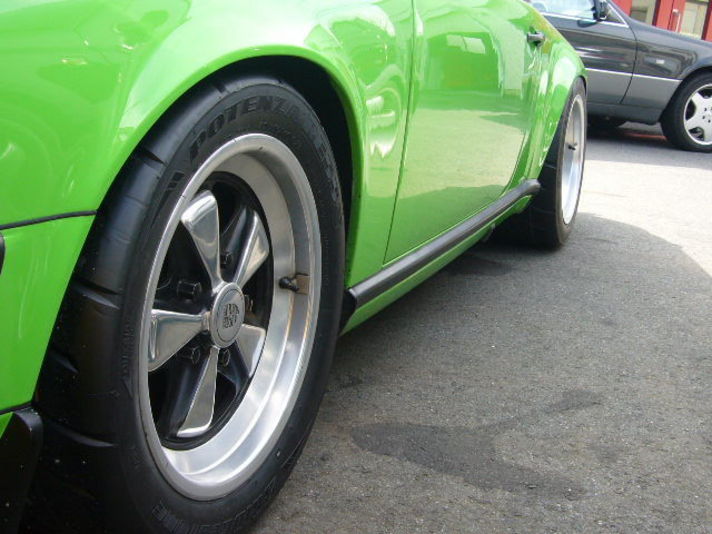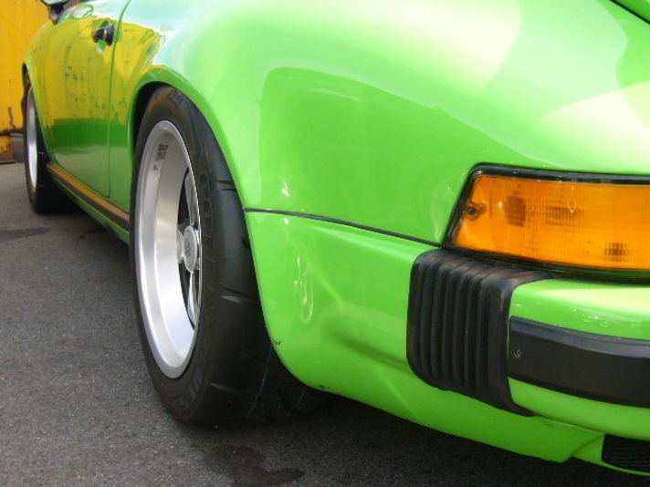 タイヤサイズは去年と同じてですが ホイルを9J(930ターボ前期タイプのみギリです) そしてホイルスにスペイサーをかまし タイヤを斜めにしました(何度かは?) あとはリアのショックを竹輪〜ボールに交換