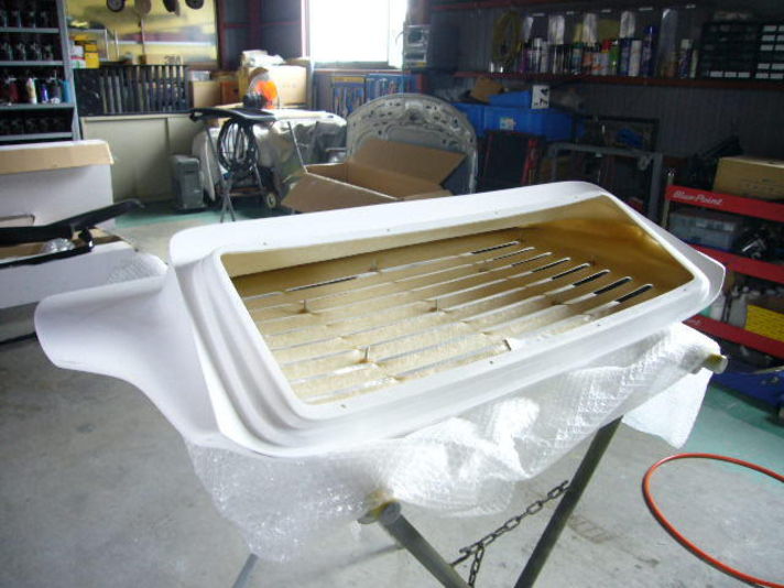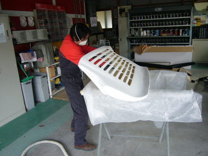 クレヨンの整備工場の中の一つに コーティング作業と軽度の板金塗装そして エアロパーツを取り付ける工場が同敷地内いにあります 今回は 964にフロントとリアウイングを取り付ける 作業を紹介いたします 今回取り付けるパーツはFRP製の一体のリアウイングです 皆さんは 色を塗り付けるだけと思われますが 実は 下処理が大変な作業なのです 写真で解るように出来るだけFRPの波を手作業で平らにして その上から下処理剤を塗ります この作業を何回か繰り返し本塗りします 最後の写真は 削ったエアロに塗装がはがれにくくするために 粘着剤を吹きつけて 乾燥さしているところです この後下地処理剤を吹き ピンホールをパテで埋めていきます この仕事は 見ていただきたいので パート2に写真付きでアップします 私には出来ない細かな作業です 注意 下処理する前に 当然仮付けして ゆがみや隙間の調整もします